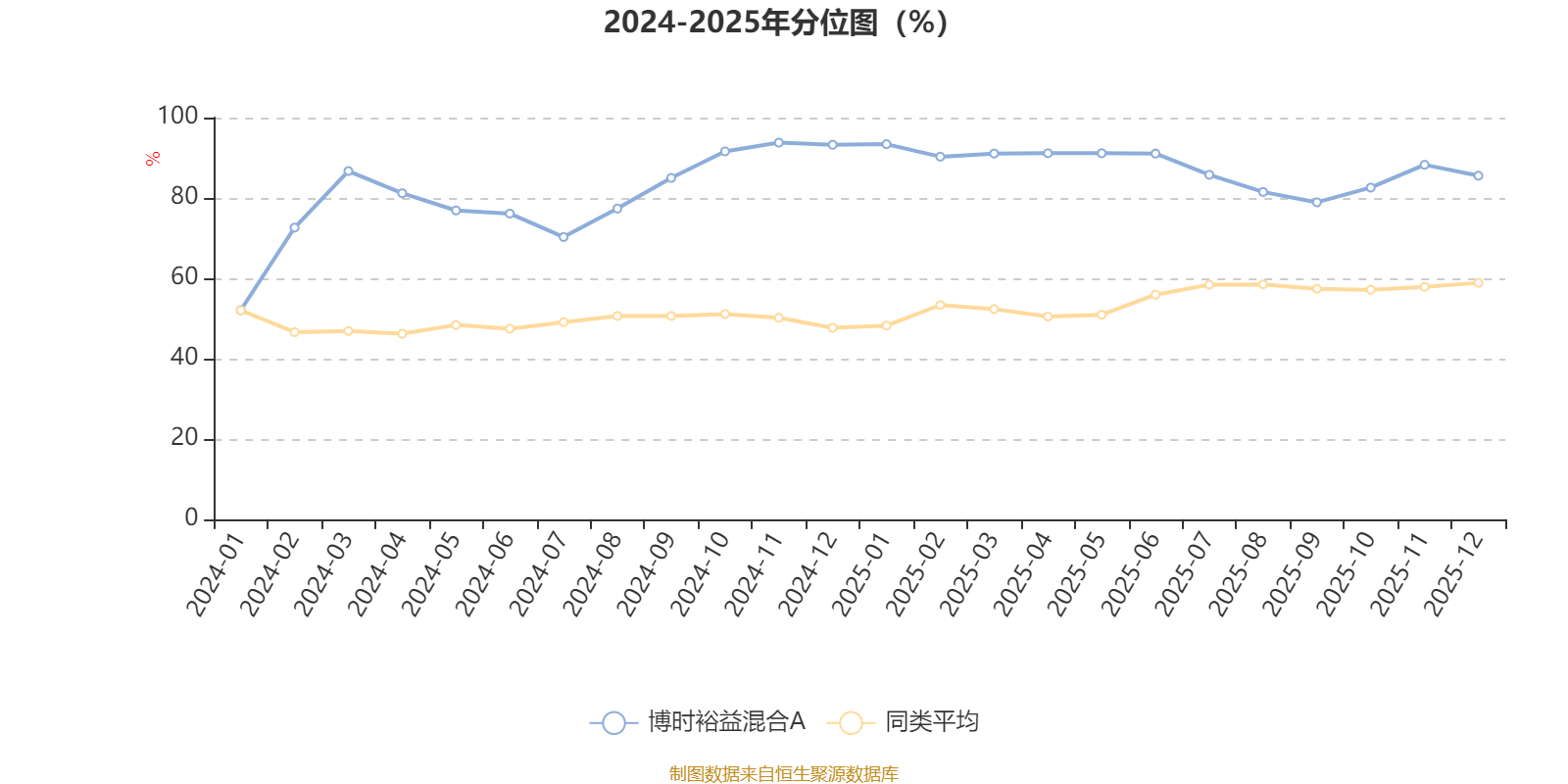 通过所选区间该基金净值增长率分位图,可以观察该基金与同类基金业绩比较情况。图为坐标原点到区间内某时点的净值增长率在同类基金中的分位数。
