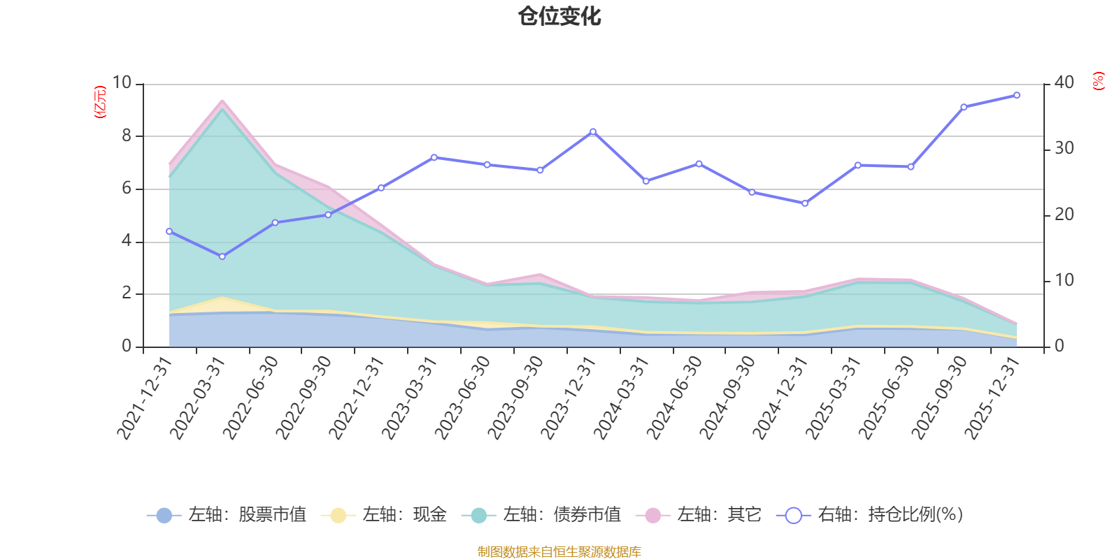据定期报告数据统计,近三年平均股票仓位为28.69%,同类平均为19.2%。2025年末基金达到38.28%的最高仓位,2022年一季度末最低,为13.75%。