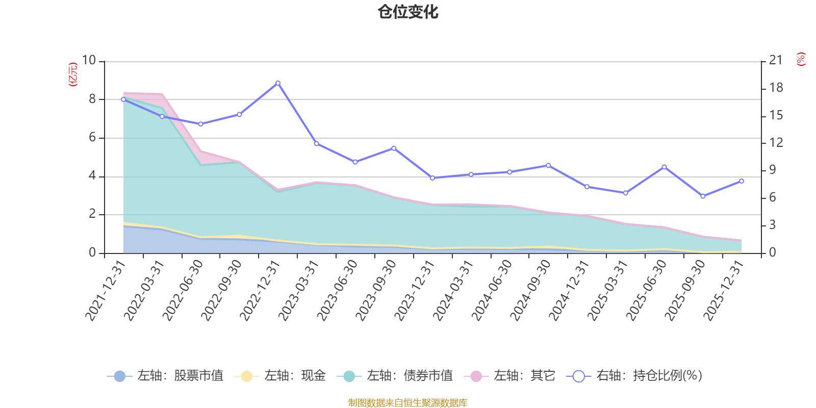据定期报告数据统计,近三年平均股票仓位为8.85%,同类平均为19.2%。2022年末基金达到18.61%的最高仓位,2025年三季度末最低,为6.24%。