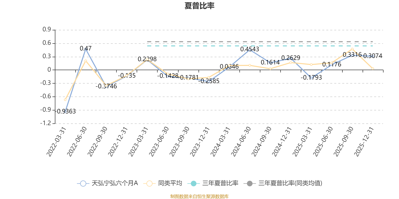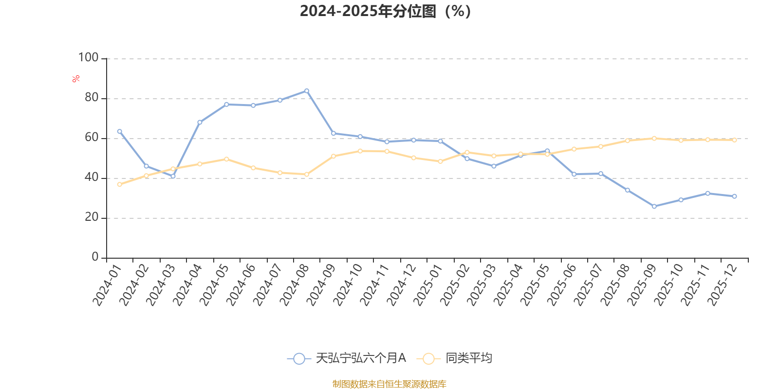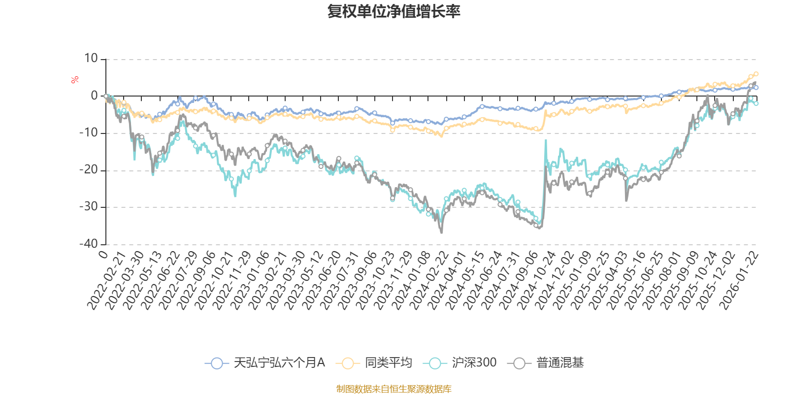 截至1月22日,天弘宁弘六个月A近三个月复权单位净值增长率为0.75%,位于同类可比基金525/629;近半年复权单位净值增长率为1.26%,位于同类可比基金563/629;近一年复权单位净值增长率为3.23%,位于同类可比基金566/626;近三年复权单位净值增长率为6.42%,位于同类可比基金443/564。