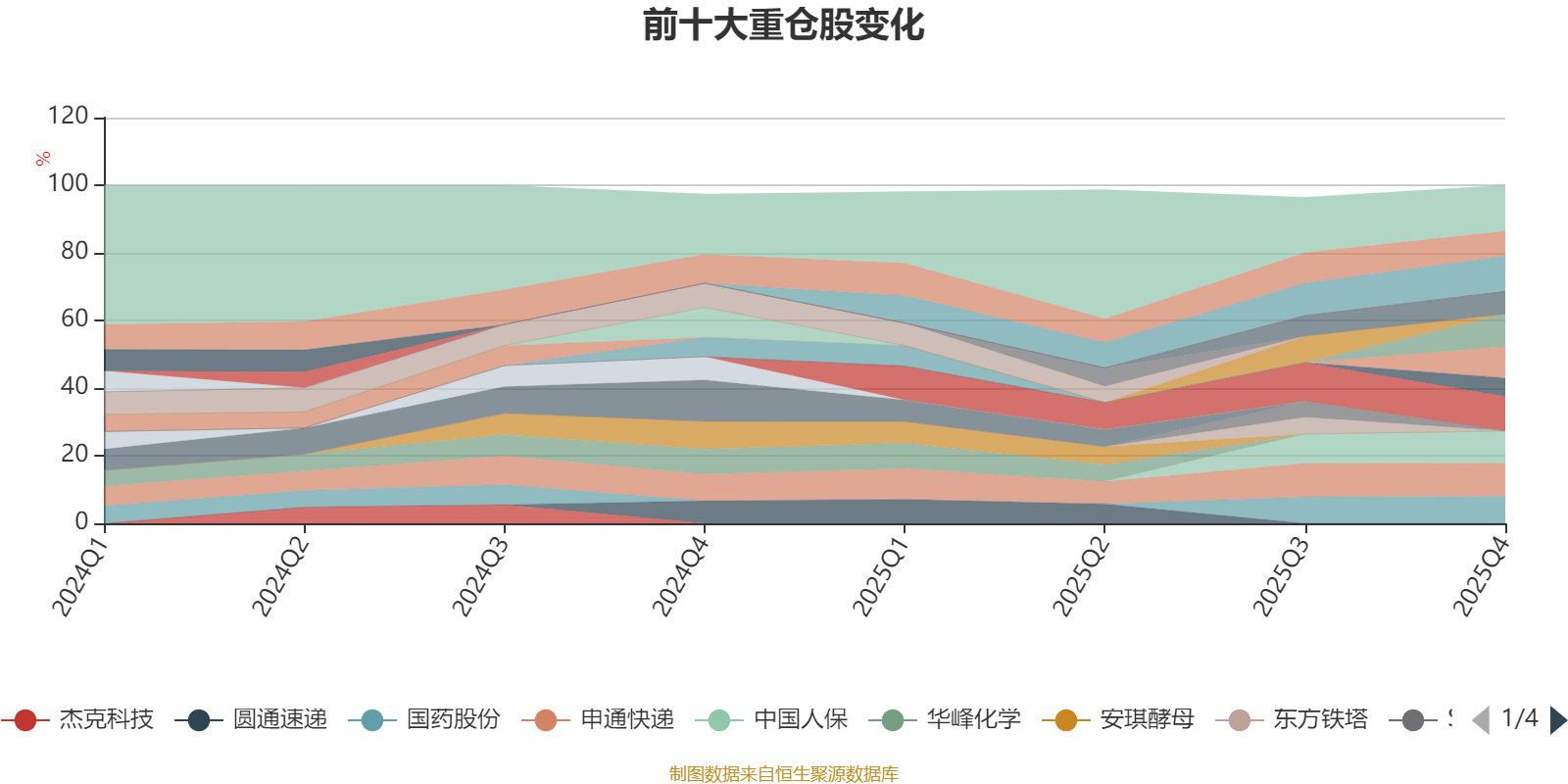 该基金持股集中度较高。截至2025年四季度末,基金十大重仓股分别是中国太保、伊利股份、申通快递、中国移动、中国人保、分众传媒、国药股份、海尔智家、国邦医药、首旅酒店。