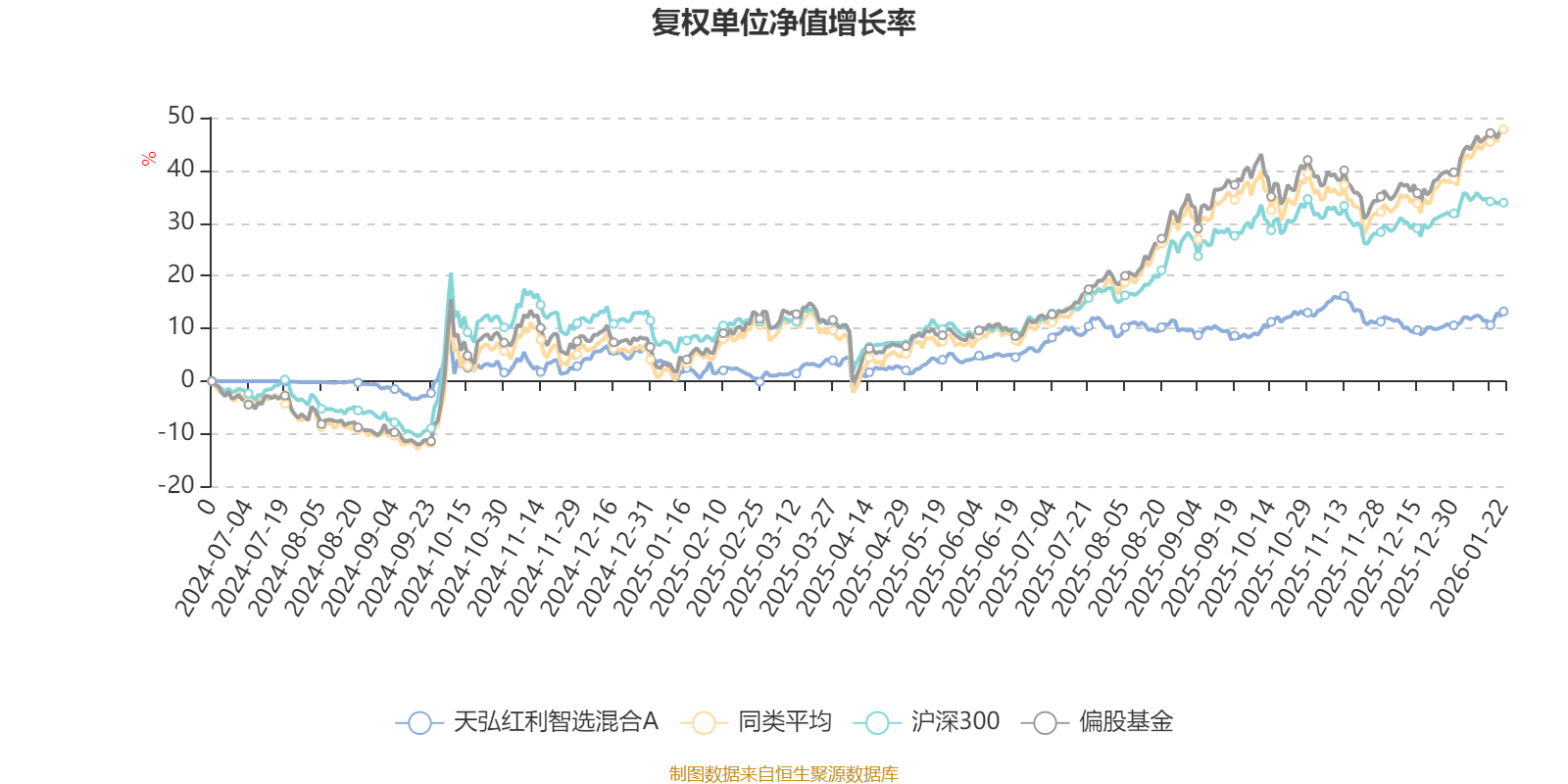 截至1月22日,天弘红利智选混合A近三个月复权单位净值增长率为0.84%,位于同类可比基金572/621;近半年复权单位净值增长率为1.11%,位于同类可比基金594/621;近一年复权单位净值增长率为12.64%,位于同类可比基金585/613。