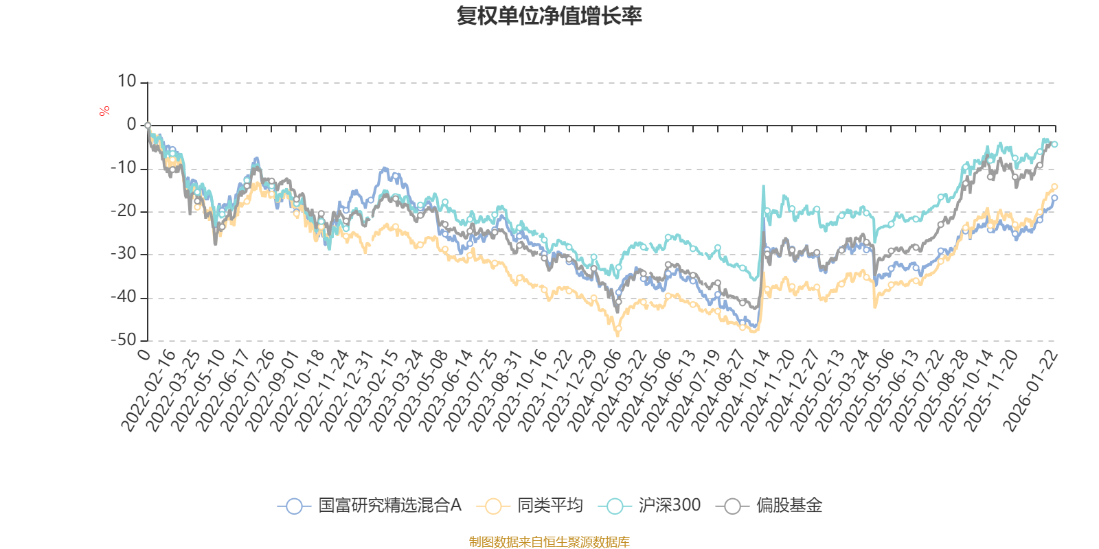 截至1月22日,国富研究精选混合A近三个月复权单位净值增长率为9.87%,位于同类可比基金329/689;近半年复权单位净值增长率为17.38%,位于同类可比基金452/689;近一年复权单位净值增长率为21.80%,位于同类可比基金551/673;近三年复权单位净值增长率为-7.51%,位于同类可比基金325/396。