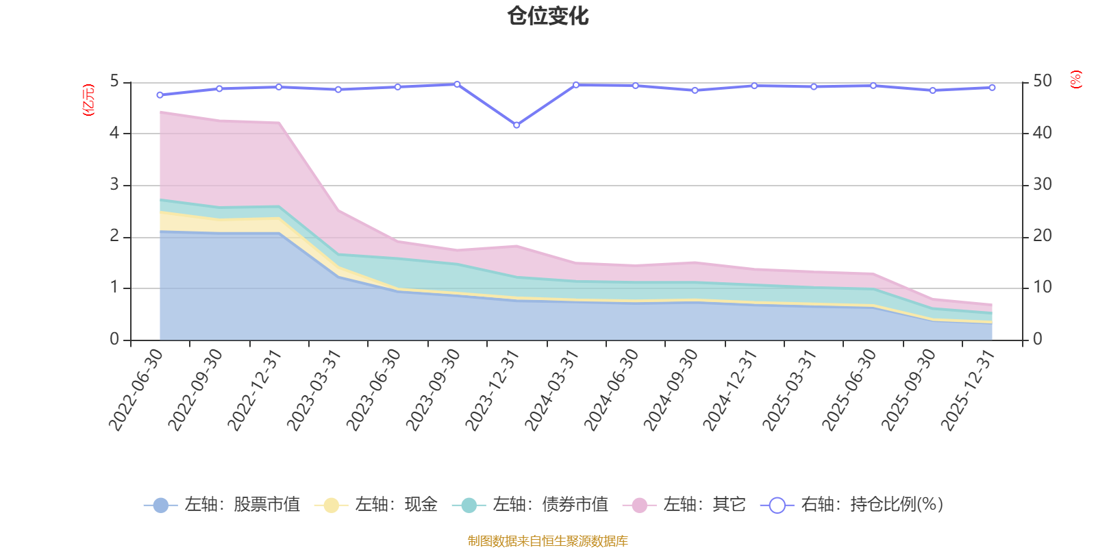 据定期报告数据统计,近三年平均股票仓位为48.45%,同类平均为19.2%。2023年三季度末基金达到49.6%的最高仓位,2023年末最低,为41.69%。