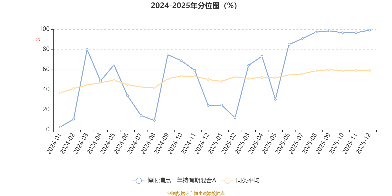 通过所选区间该基金净值增长率分位图,可以观察该基金与同类基金业绩比较情况。图为坐标原点到区间内某时点的净值增长率在同类基金中的分位数。