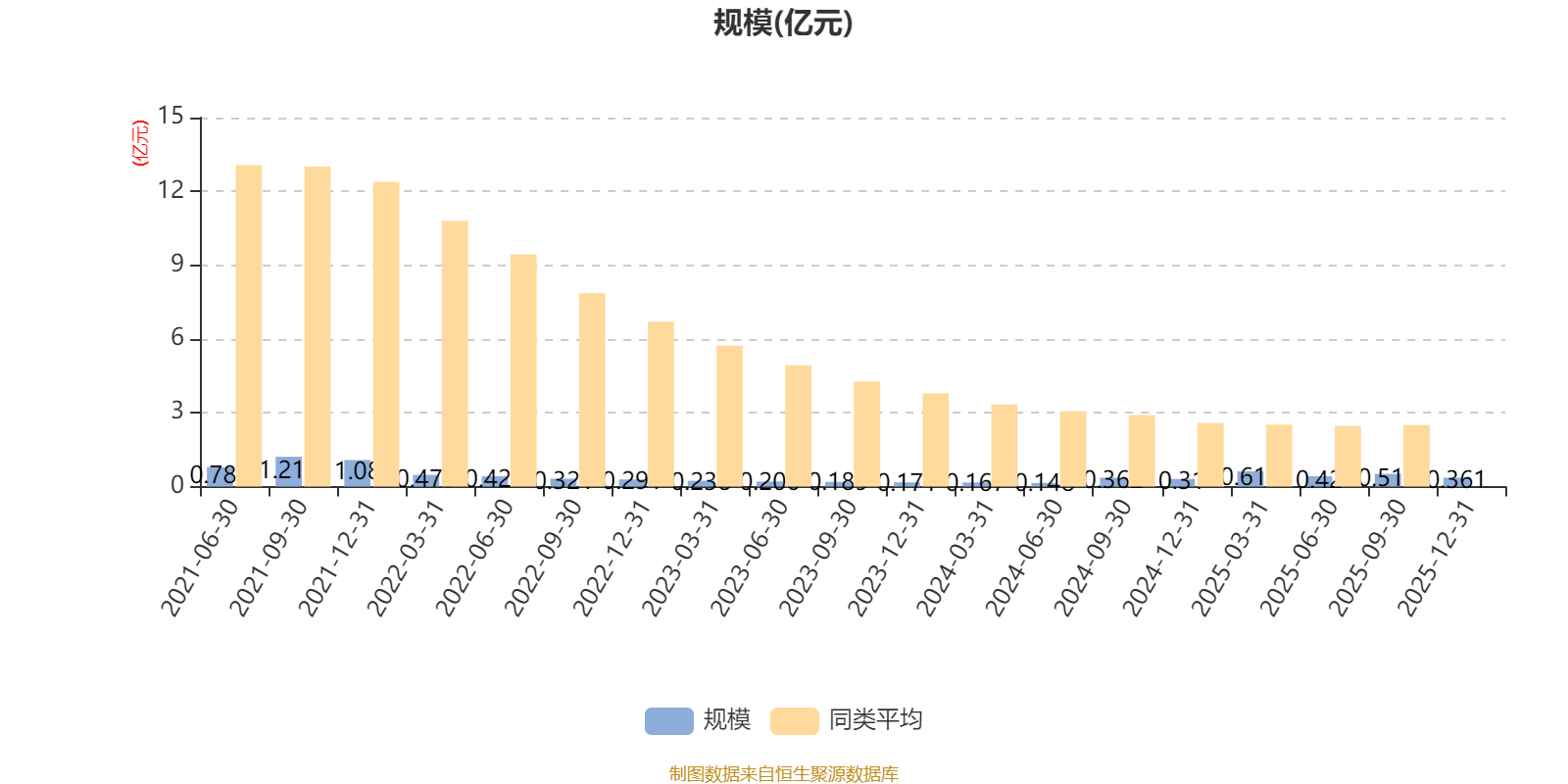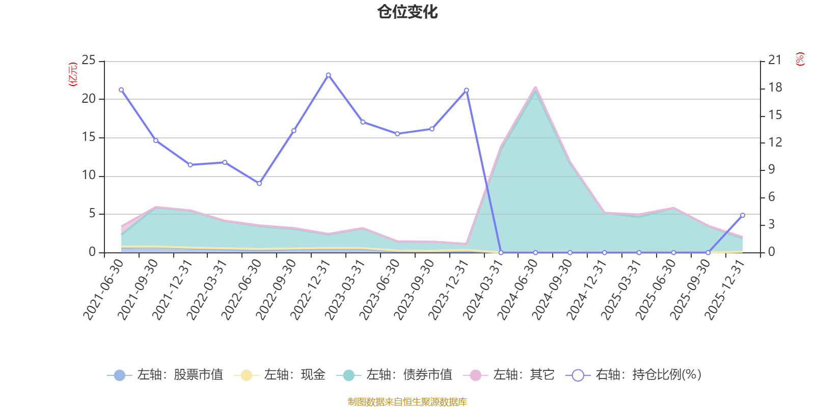 据定期报告数据统计,近三年平均股票仓位为5.23%,同类平均为19.25%。2022年末基金达到19.47%的最高仓位,2025年末最低,为4.09%。