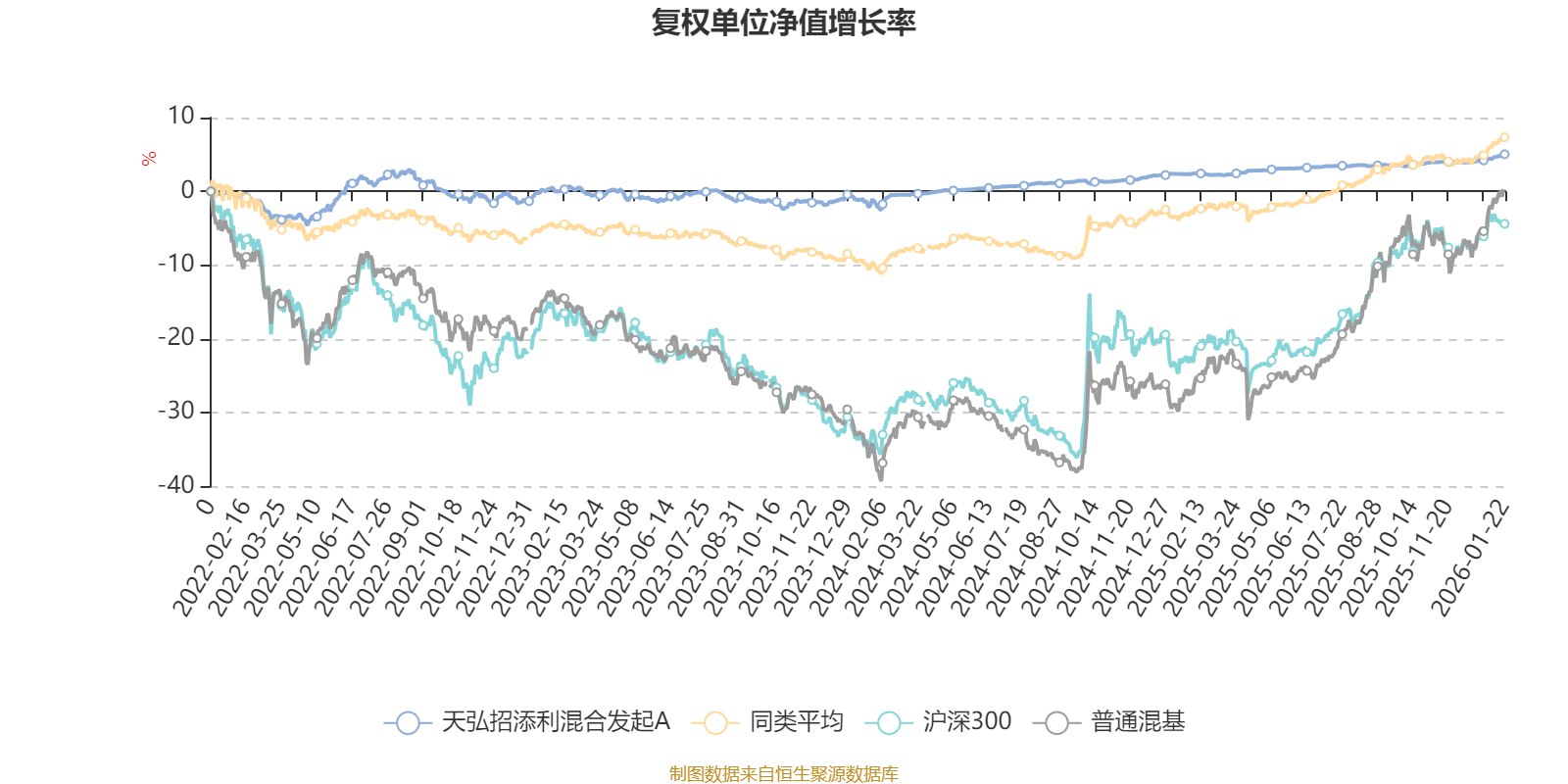 截至1月22日,天弘招添利混合发起A近三个月复权单位净值增长率为1.27%,位于同类可比基金469/683;近半年复权单位净值增长率为1.50%,位于同类可比基金566/683;近一年复权单位净值增长率为2.62%,位于同类可比基金612/683;近三年复权单位净值增长率为4.79%,位于同类可比基金487/617。