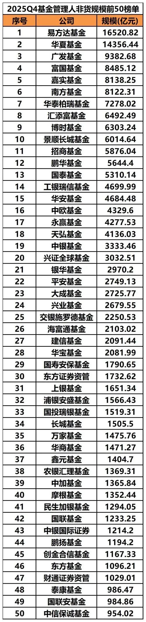 从非货币基金规模看,易方达基金非货币基金规模为1.65万亿元,位居全市场第一;华夏基金以1.44万亿元名列第二;广发基金以9382.68亿元位居第三。