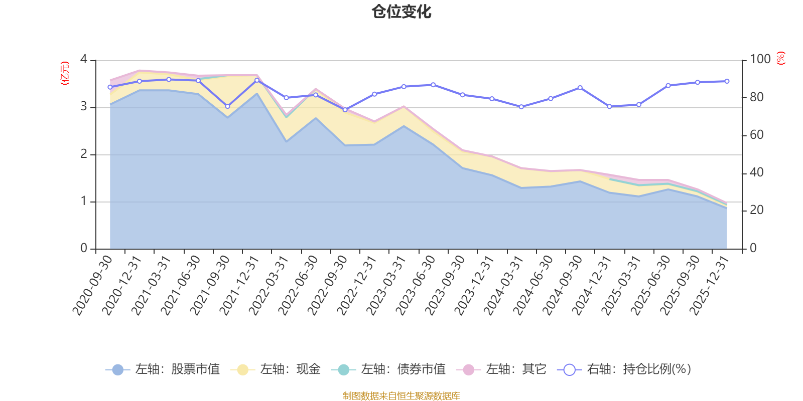 据定期报告数据统计,近三年平均股票仓位为82.49%,同类平均为72.57%。2021年一季度末基金达到89.77%的最高仓位,2022年三季度末最低,为73.69%。