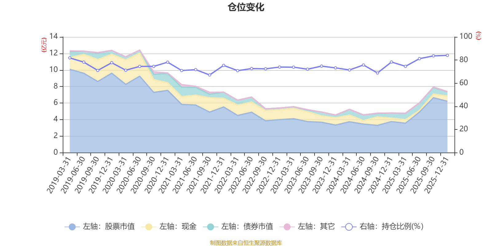 据定期报告数据统计,近三年平均股票仓位为75.99%,同类平均为72.57%。2025年末基金达到84.05%的最高仓位,2021年三季度末最低,为67.13%。