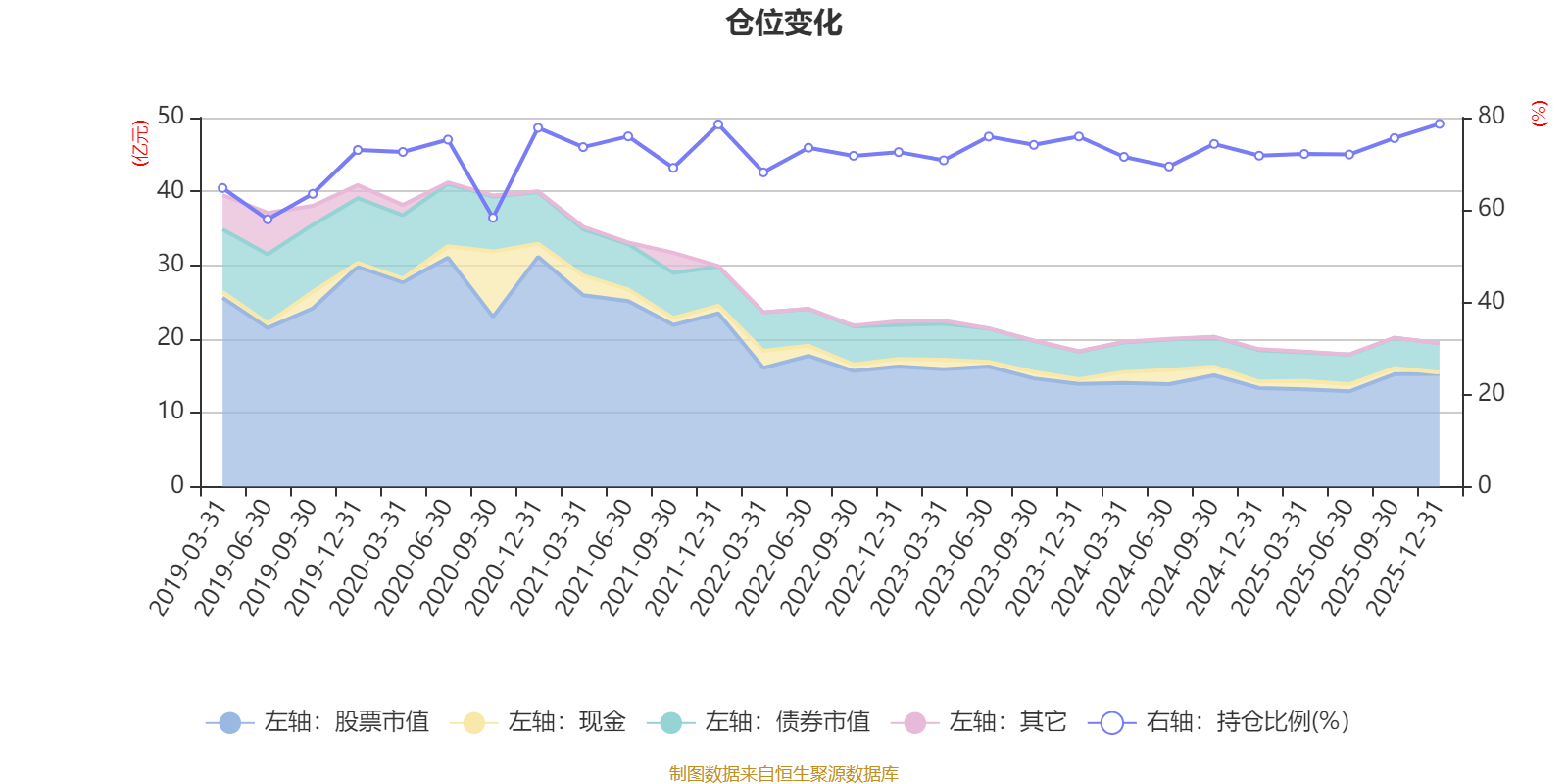 据定期报告数据统计,近三年平均股票仓位为73.5%,同类平均为72.57%。2025年末基金达到78.64%的最高仓位,2019年上半年末最低,为57.95%。