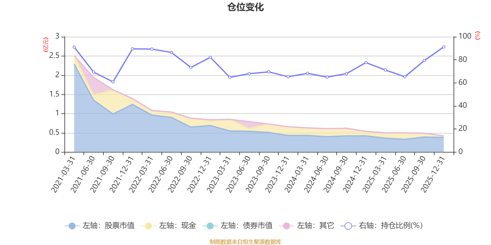 据定期报告数据统计,近三年平均股票仓位为71.13%,同类平均为84.04%。2025年末基金达到91.19%的最高仓位,2021年三季度末最低,为60.89%。