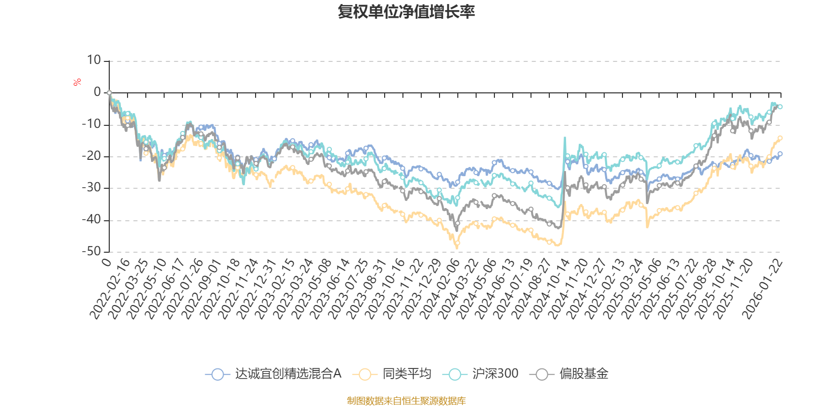 截至1月22日,达诚宜创精选混合A近三个月复权单位净值增长率为2.97%,位于同类可比基金554/689;近半年复权单位净值增长率为5.04%,位于同类可比基金613/689;近一年复权单位净值增长率为10.34%,位于同类可比基金639/673;近三年复权单位净值增长率为-4.04%,位于同类可比基金315/396。