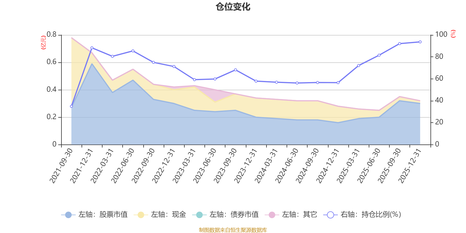 据定期报告数据统计,近三年平均股票仓位为67.56%,同类平均为72.57%。2025年末基金达到93.67%的最高仓位,2021年三季度末最低,为34.93%。