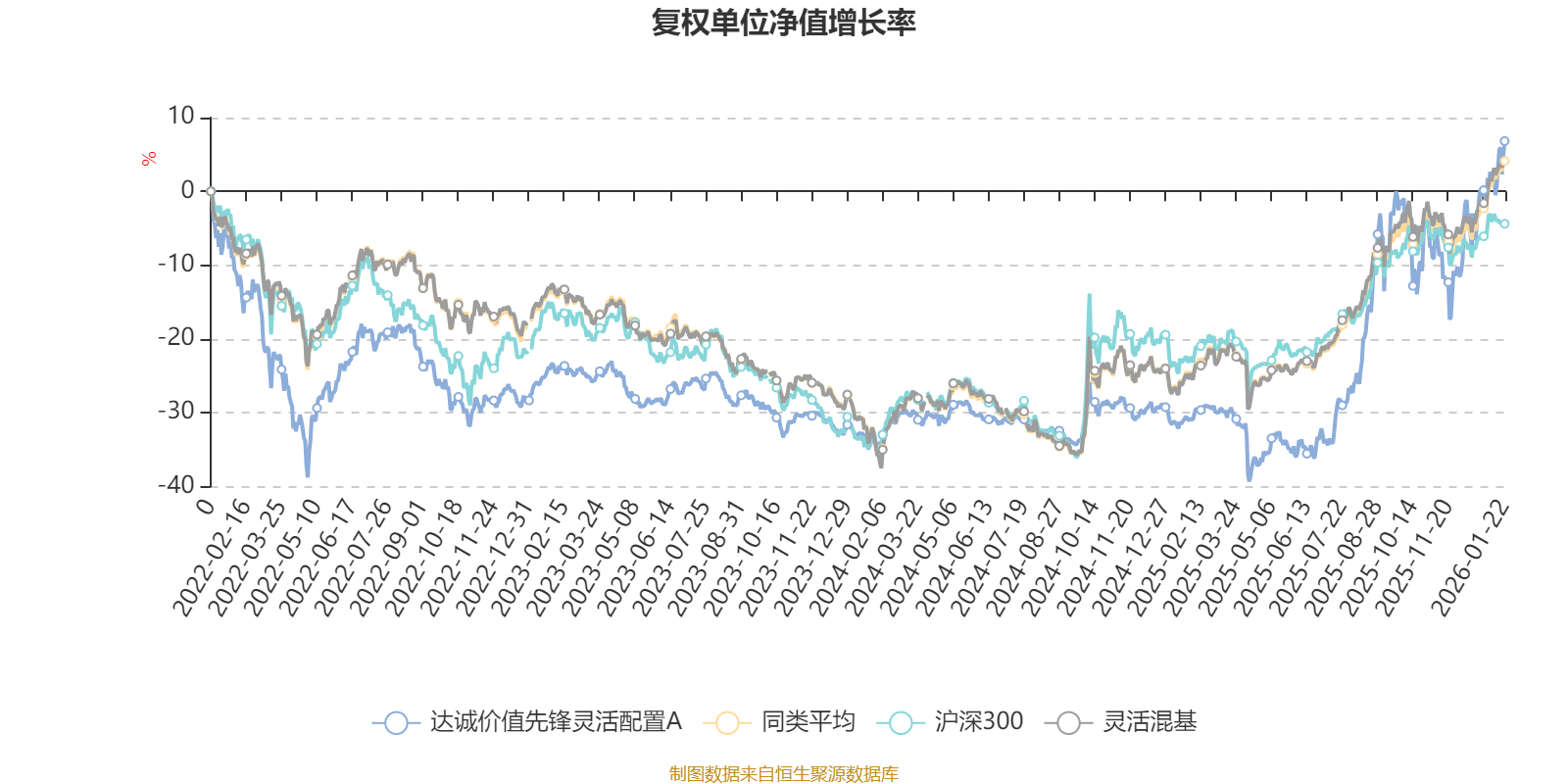 截至1月22日,达诚价值先锋灵活配置A近三个月复权单位净值增长率为18.13%,位于同类可比基金175/1286;近半年复权单位净值增长率为50.40%,位于同类可比基金151/1286;近一年复权单位净值增长率为54.53%,位于同类可比基金275/1286;近三年复权单位净值增长率为41.04%,位于同类可比基金260/1286。