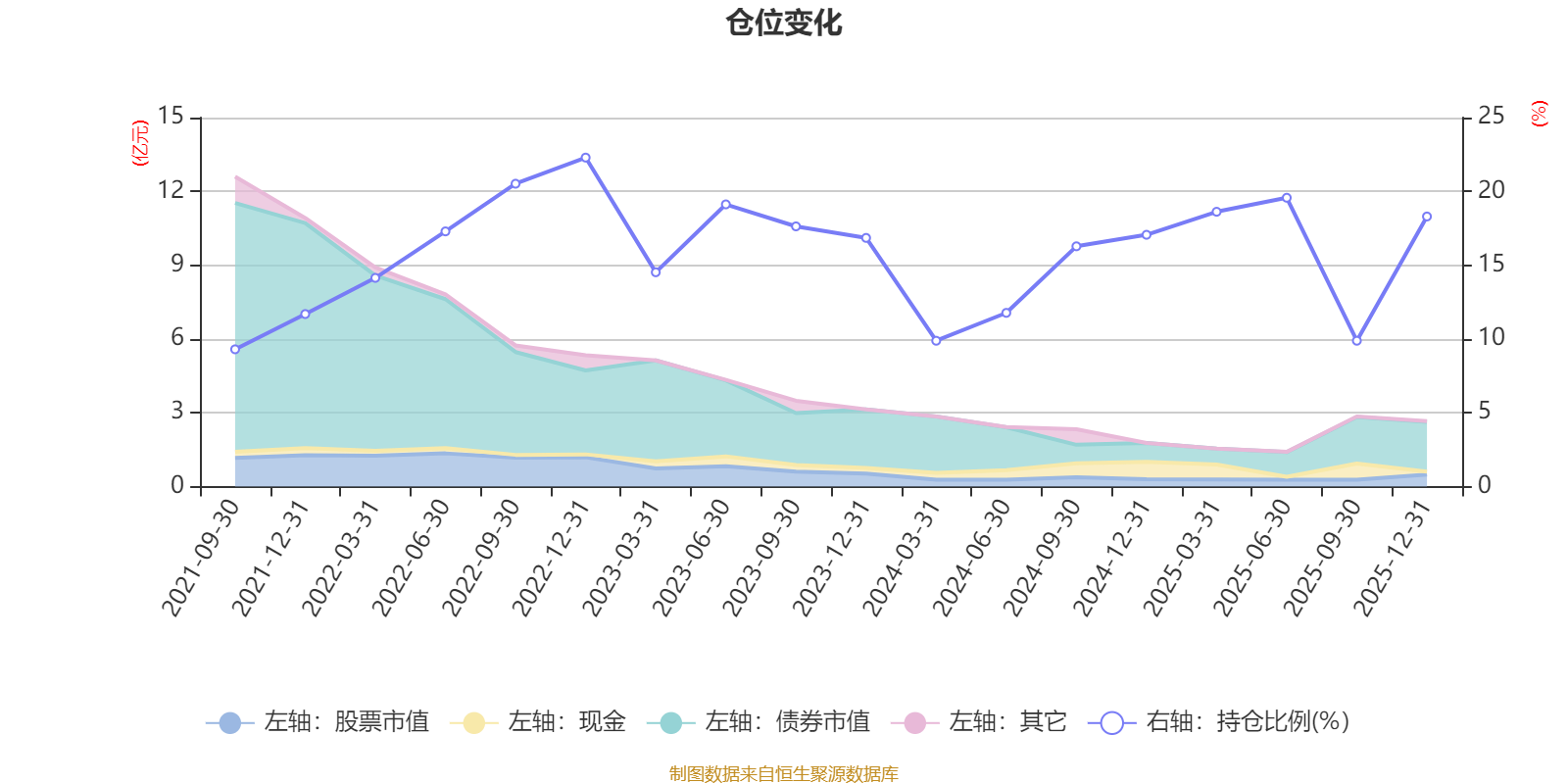 据定期报告数据统计,近三年平均股票仓位为15.79%,同类平均为19.2%。2022年末基金达到22.29%的最高仓位,2021年三季度末最低,为9.3%。