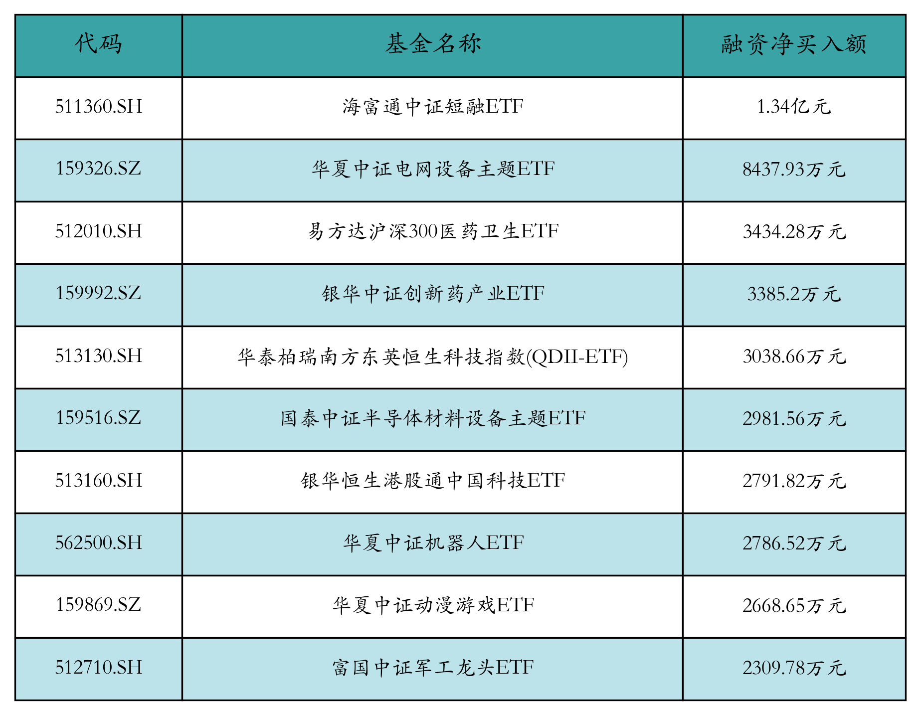1月22日ETF融资净买入额前三位分别为:海富通中证短融ETF(1.34亿元)、华夏中证电网设备主题ETF(8437.93万元)和易方达沪深300医药卫生ETF(3434.28万元),前10具体见下表: