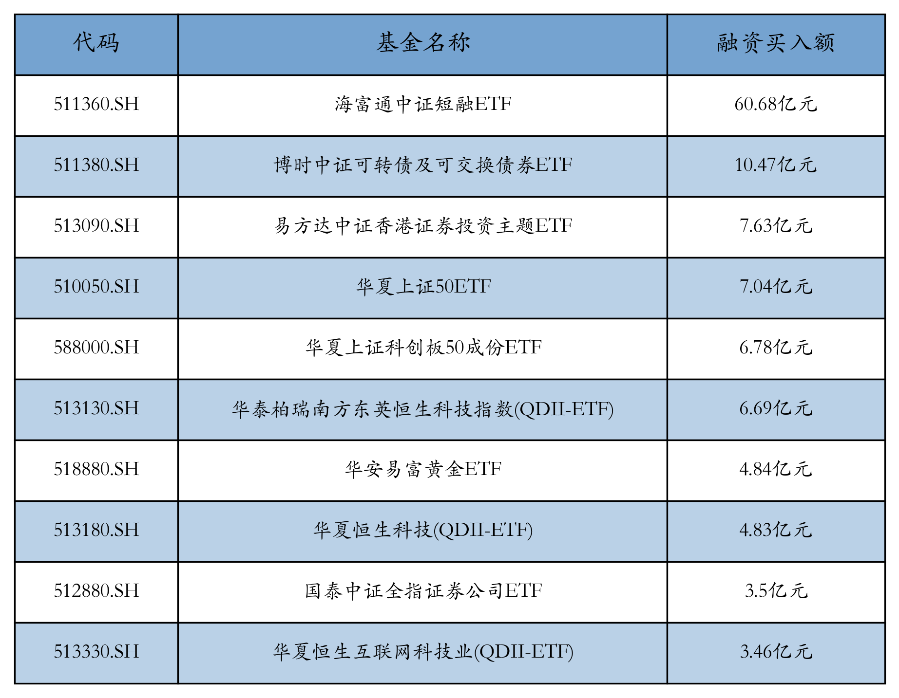 1月22日ETF融资买入额前三位分别为:海富通中证短融ETF(60.68亿元)、博时中证可转债及可交换债券ETF(10.47亿元)和易方达中证香港证券投资主题ETF(7.63亿元),前10具体见下表: