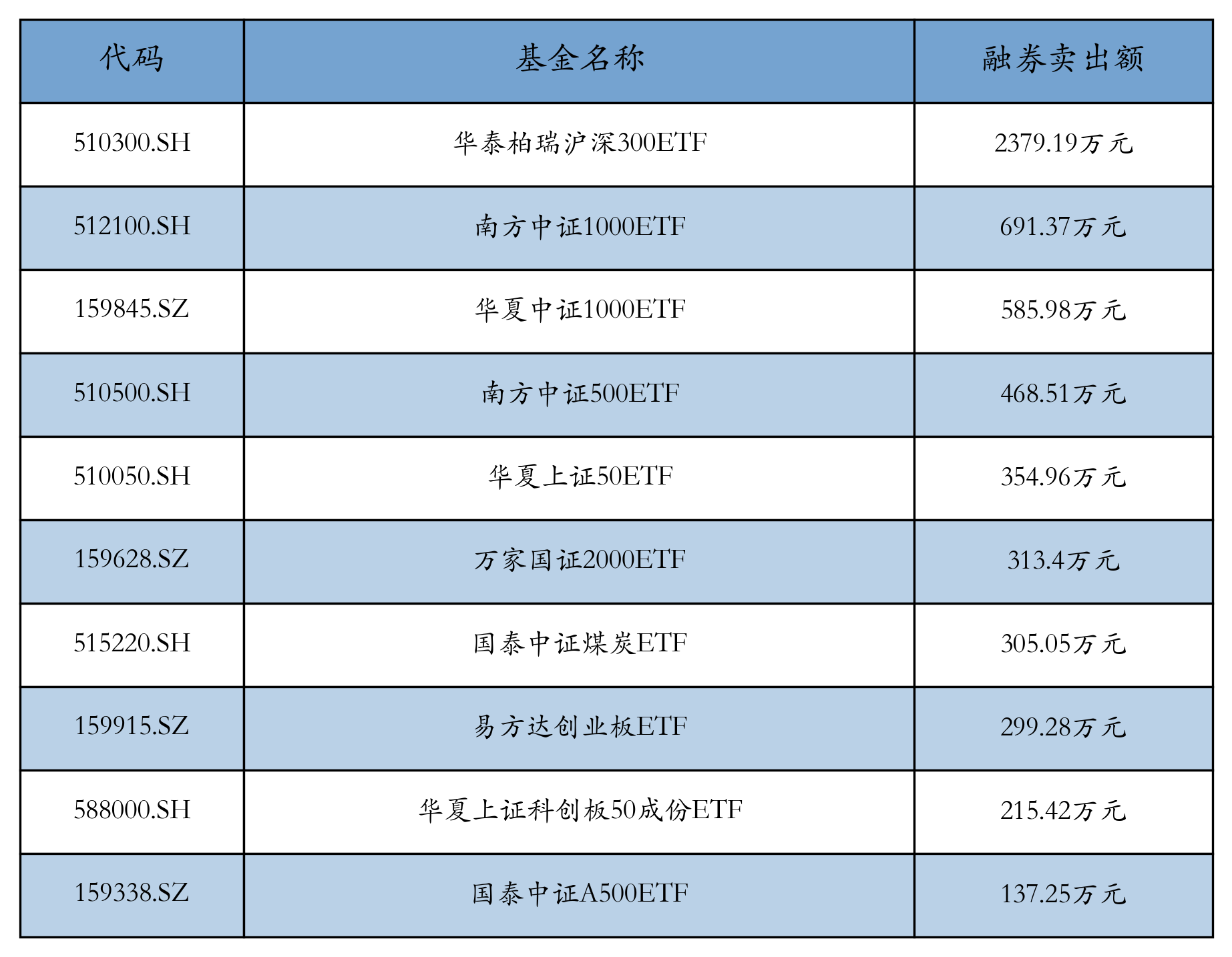 1月22日ETF融券卖出额前三位分别为:华泰柏瑞沪深300ETF(2379.19万元)、南方中证1000ETF(691.37万元)和华夏中证1000ETF(585.98万元),前10具体见下表: