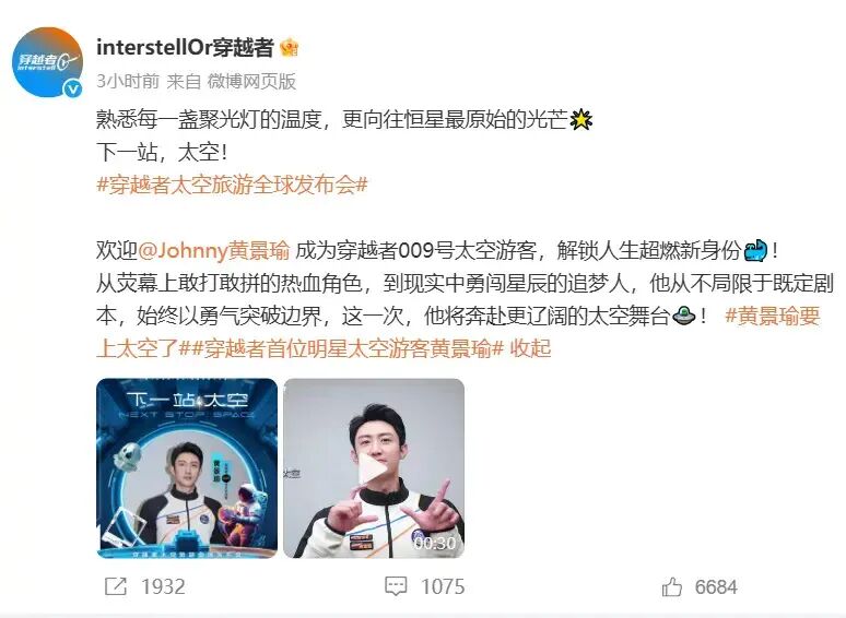 1月22日,@interstellOr穿越者官宣@Johnny黄景瑜成为009号太空游客,黄景瑜在vcr中表示很荣幸成为一名太空旅客,将乘坐中国人自己的飞船亲身抵达那片星海。