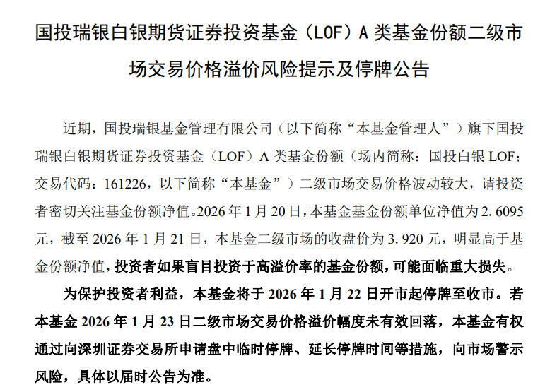 国投白银LOF发布公告称,为保护投资者利益,本基金将于1月22日开市起停牌至收市。若本基金1月23日二级市场交易价格溢价幅度未有效回落,本基金有权通过向深交所申请盘中临时停牌、延长停牌时间等措施,向市场警示风险。