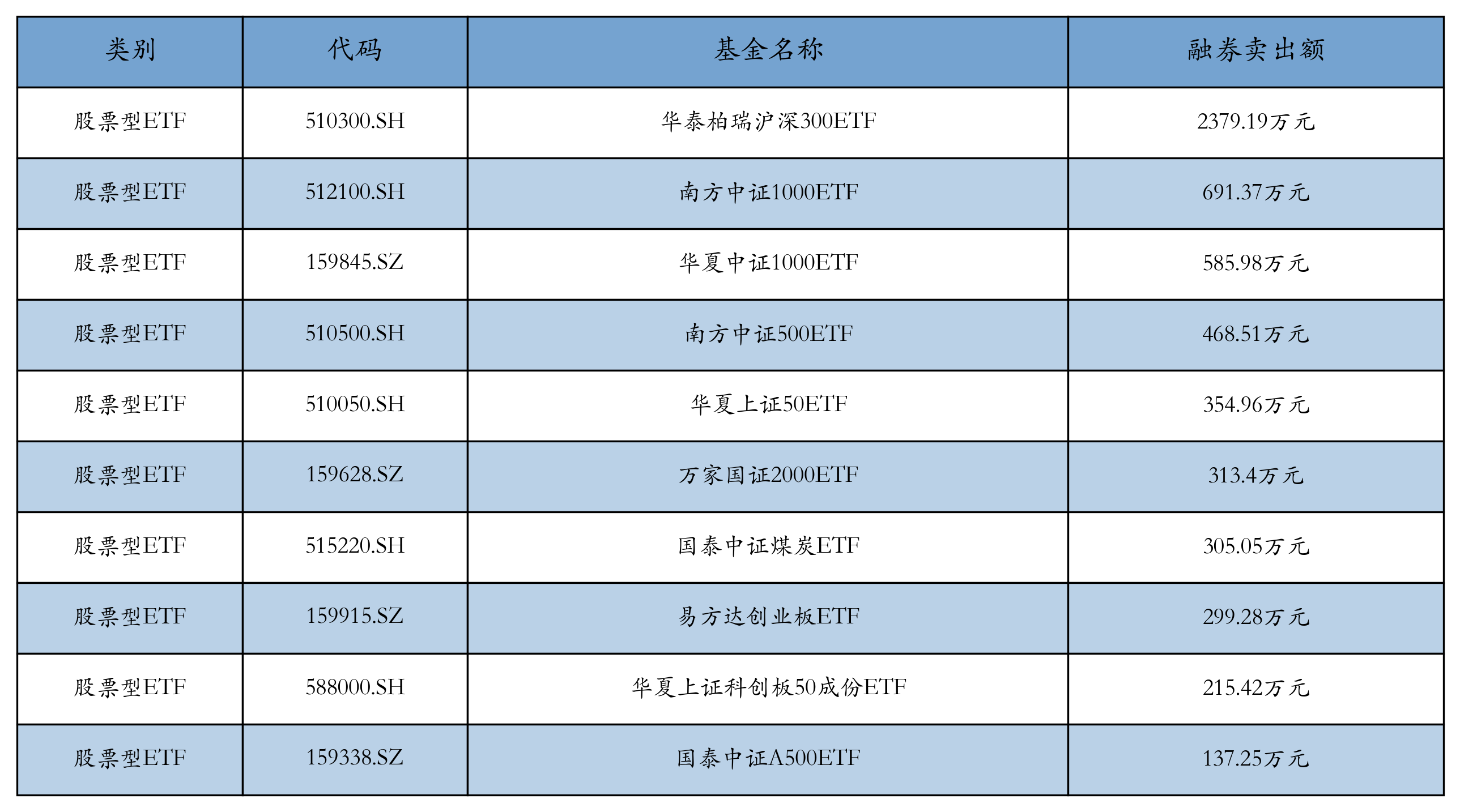 昨日股票型ETF融资卖出额最高的3只ETF及其卖出金额分别为:华泰柏瑞沪深300ETF(2379.19万元)、南方中证1000ETF(691.37万元)、华夏中证1000ETF(585.98万元)。融券卖出额前10详情见下表:
