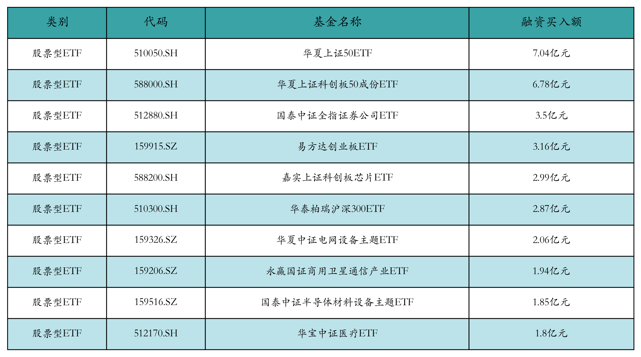 昨日股票型ETF融资买入额最高的3只ETF及其买入金额分别为:华夏上证50ETF(7.04亿元)、华夏上证科创板50成份ETF(6.78亿元)、国泰中证全指证券公司ETF(3.5亿元)。融资买入额前10详情见下表:
