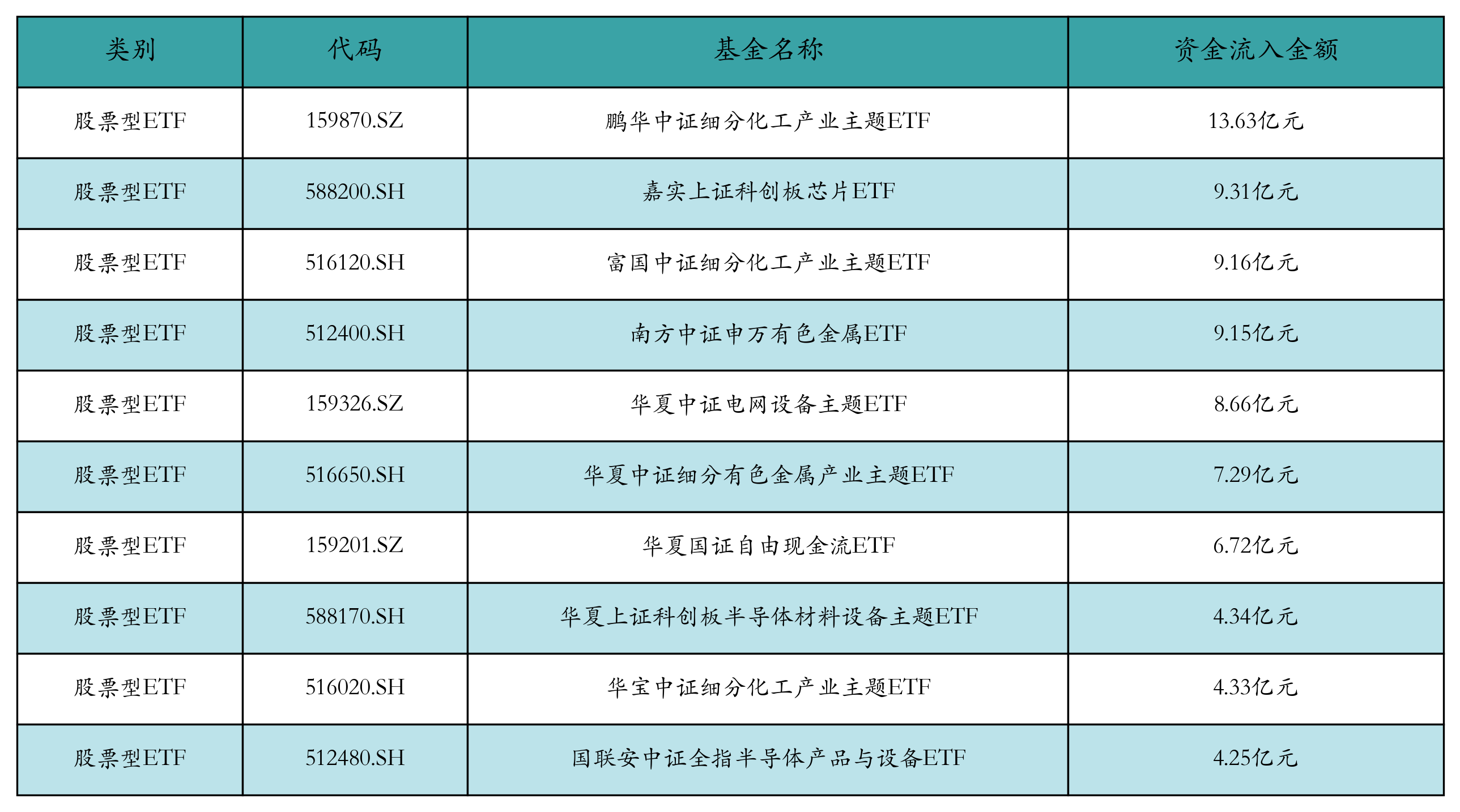 昨日股票型ETF资金流入最多的3只ETF及其流入金额分别为:鹏华中证细分化工产业主题ETF(流入13.63亿元)、嘉实上证科创板芯片ETF(流入9.31亿元)、富国中证细分化工产业主题ETF(流入9.16亿元)。资金流入前10详情见下表: