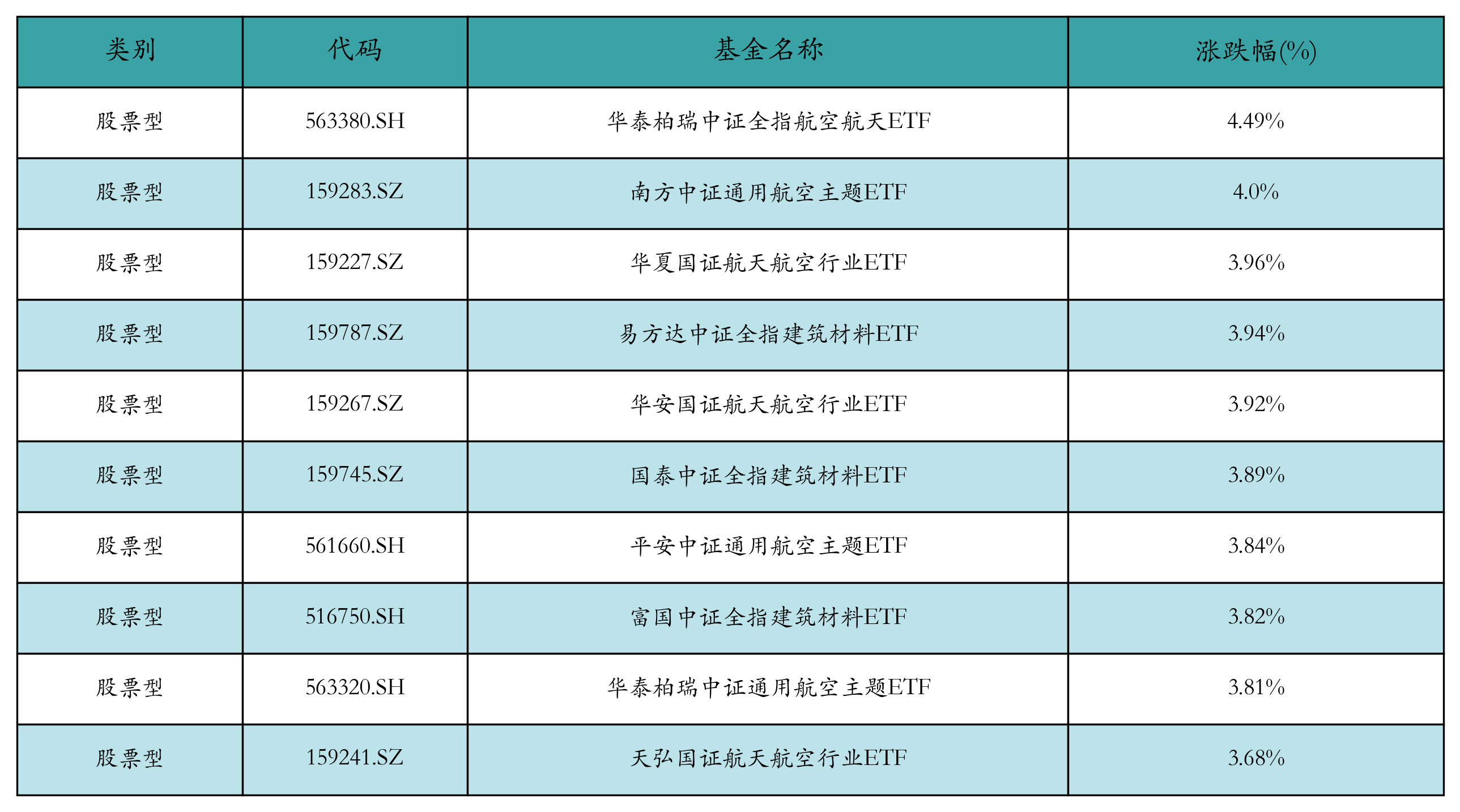 昨日股票型ETF涨幅最高的3只ETF及其收益率分别为:华泰柏瑞中证全指航空航天ETF(4.49%)、南方中证通用航空主题ETF(4.0%)、华夏国证航天航空行业ETF(3.96%)。涨幅前10详情见下表: