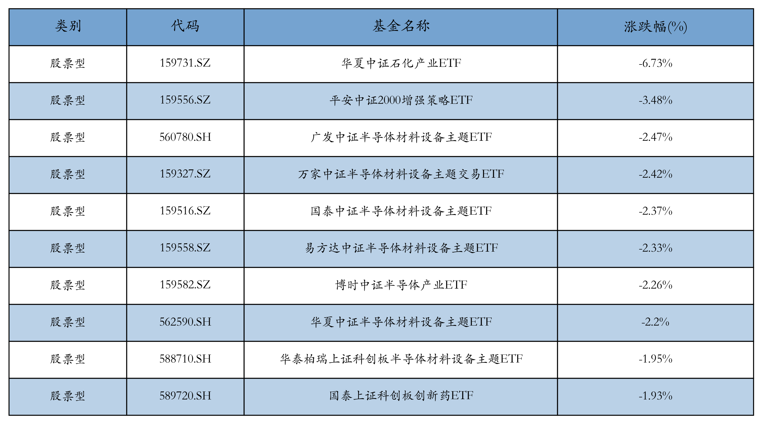 昨日股票型ETF跌幅最大的3只ETF及其收益率分别为:华夏中证石化产业ETF(-6.73%)、平安中证2000增强策略ETF(-3.48%)、广发中证半导体材料设备主题ETF(-2.47%)。跌幅前10详情见下表: