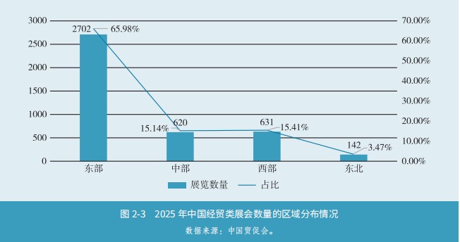 2025 年,中国经贸类展会仍呈现区域集聚特征,但长期以来东部地区的主导格局正在悄然变化。