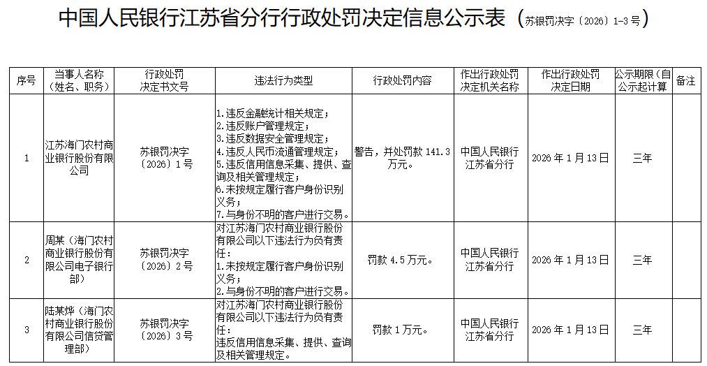 【大河财立方消息】1月23日消息,中国人民银行江苏省分行日前披露的行政处罚决定信息公示表显示,江苏海门农村商业银行股份有限公司被警告,并处罚款141.3万元。