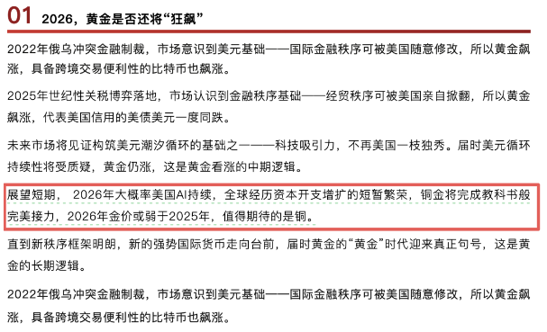 同时,有观点认为,铜有望接棒黄金成为2026年的新焦点。中信建投证券研究部在1月22日发布的《黄金价格走势及投资前景》系列研究中指出:“展望短期,2026年大概率美国AI持续,全球经历资本开支增扩的短暂繁荣,铜金将完成教科书般完美接力,2026年金价或弱于2025年,值得期待的是铜。”