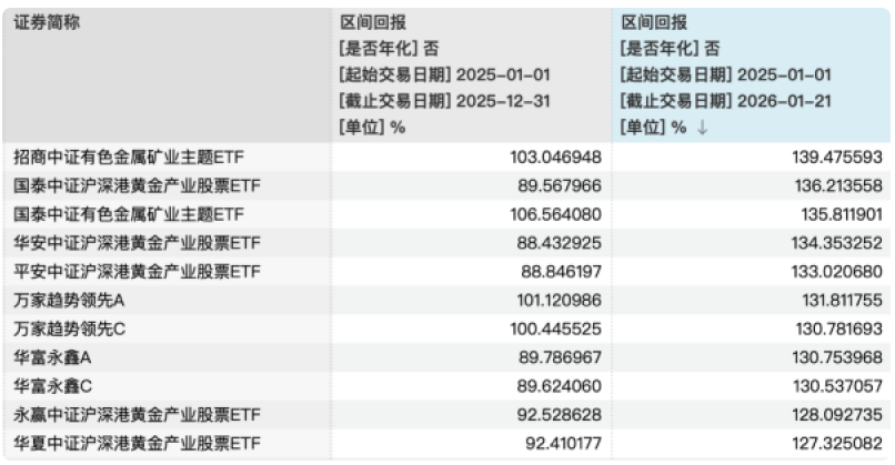 数据显示,有色金属与黄金主题基金表现尤为突出,双双录得显著涨幅,自2025年初至2026年1月21日,多只相关主题基金区间回报率超过100%。