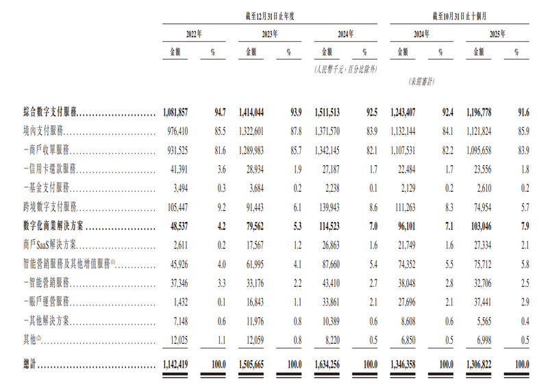 据介绍,富友支付是全能型数字化支付科技平台,为客户提供多渠道支付服务以及管理和其他增值服务,公司的大部分收入来自收单服务。自成立以来及截至2025年10月31日,富友支付已处理TPV人民币16.34万亿元,处理逾679亿笔支付交易。