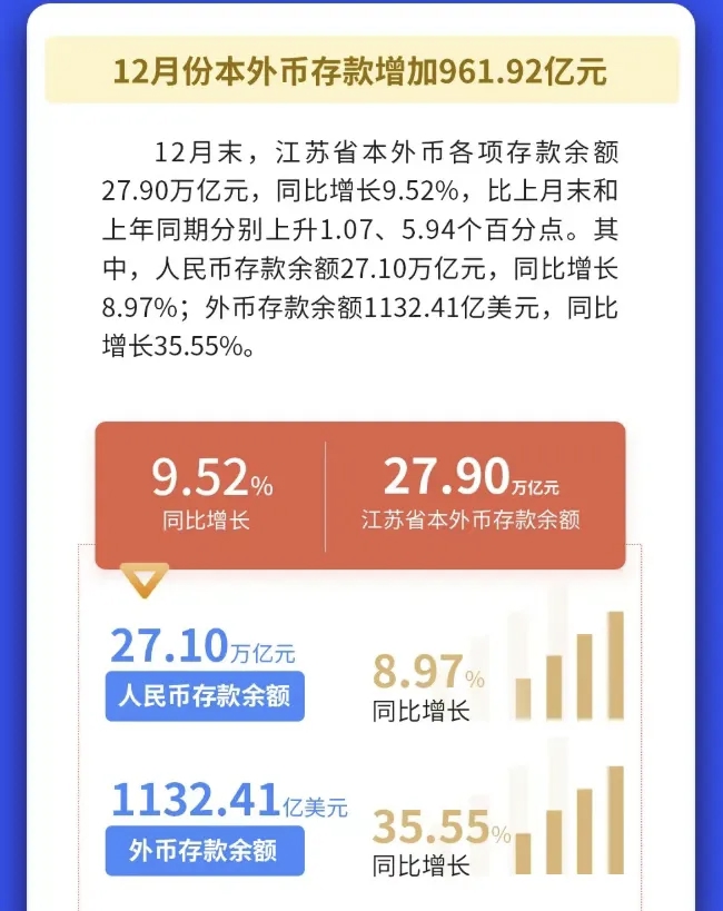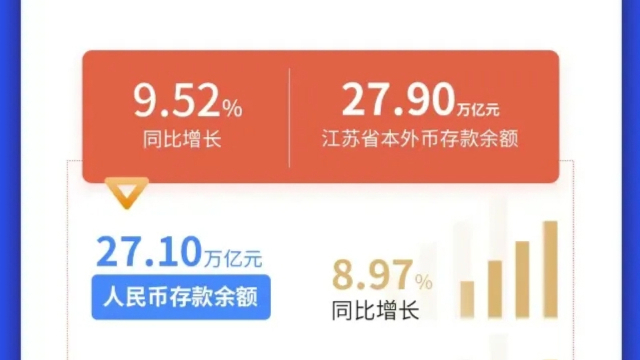 人民银行江苏省分行最新数据显示,截至2025年底,江苏省本外币存款余额27.9万亿元,比去年同比增长9.52%。其中,住户存款13.3万亿元。按全省常住人口8526万人计算,江苏的人均存款为15.6万元。相比2024年的13.99万元,人均多存1.6万元。