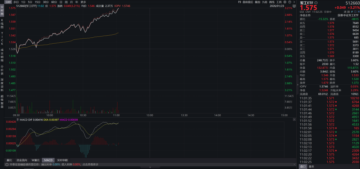 军工行业基本面再受提振,市场认可军工板块高景气,军工ETF(512660)涨超3%。