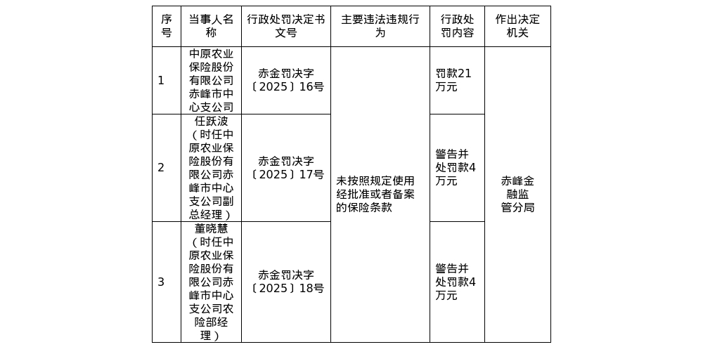 此外,时任中原农业保险股份有限公司赤峰市中心支公司副总经理的任跃波、农险部经理的董晓慧,分别被警告并处罚款4万元。