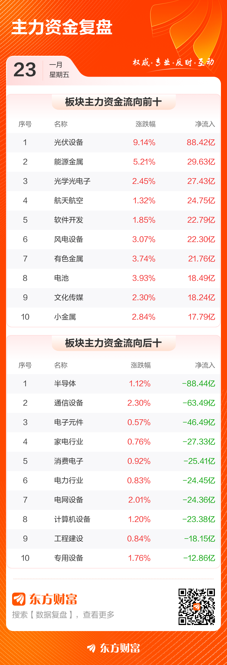 1月23日,沪指涨0.33%,深成指涨0.79%,创业板指涨0.63%。两市成交额3.09万亿,较上个交易日放量3935亿。数据显示,今日大盘主力资金净流出224.99亿。光伏设备、能源金属、光学光电子等板块主力资金流入排名居前,其中光伏设备净流入88.42亿元。