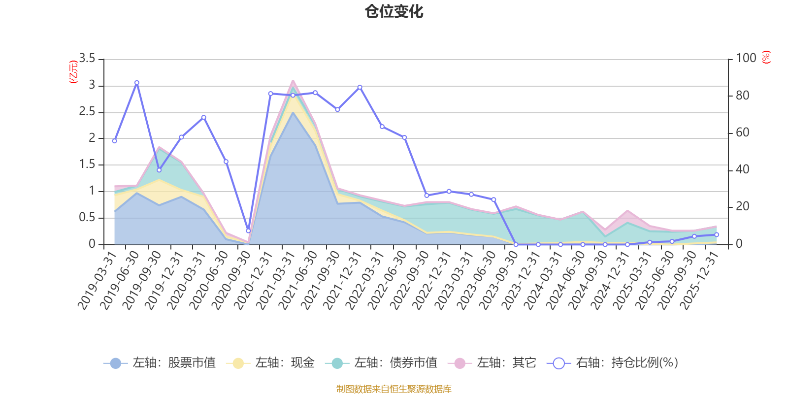 据定期报告数据统计,近三年平均股票仓位为5.34%,同类平均为72.57%。2019年上半年末基金达到87.31%的最高仓位,2025年一季度末最低,为1.25%。