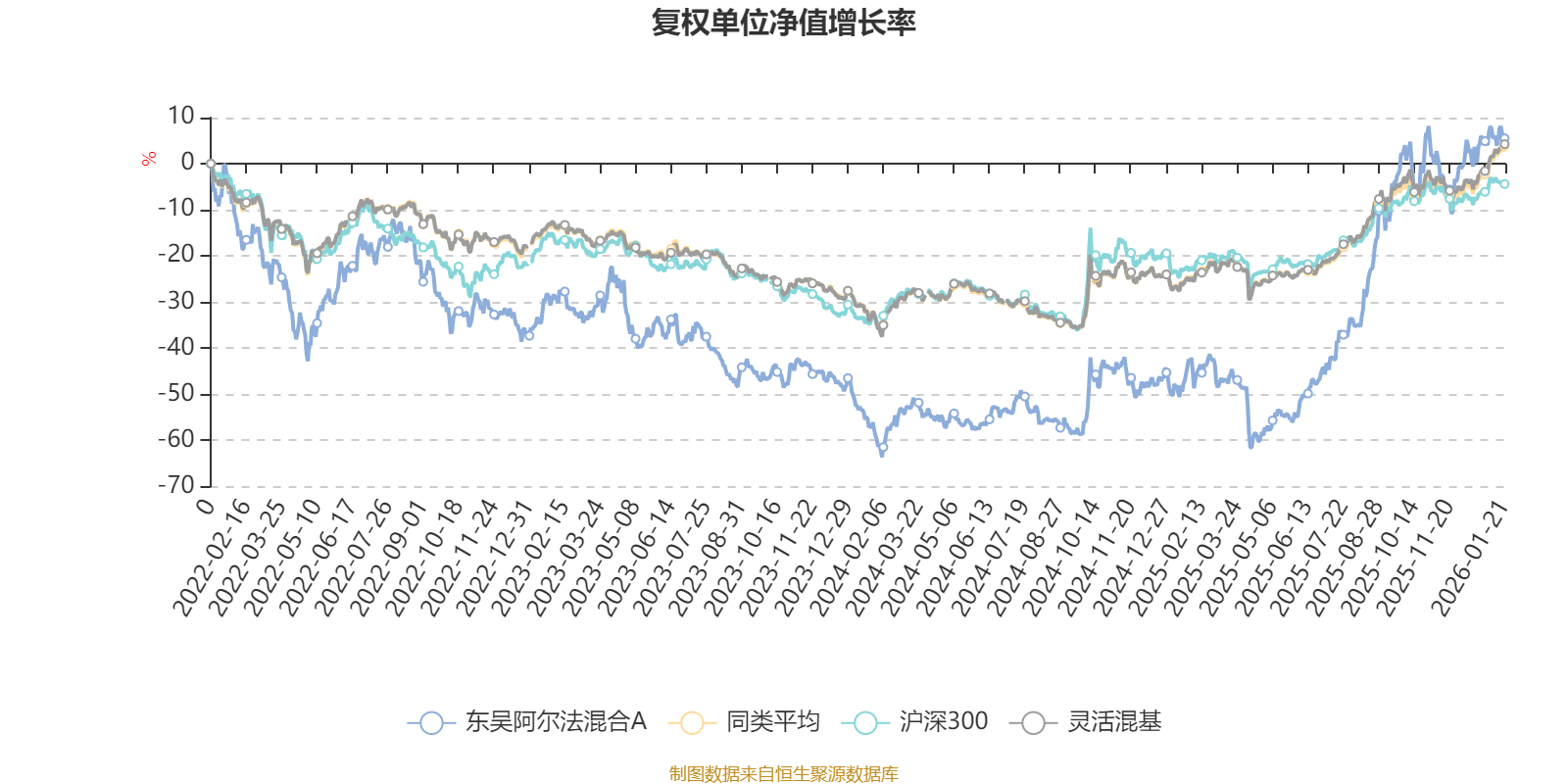 截至1月21日,东吴阿尔法混合A近三个月复权单位净值增长率为5.87%,位于同类可比基金787/1286;近半年复权单位净值增长率为66.95%,位于同类可比基金49/1286;近一年复权单位净值增长率为88.46%,位于同类可比基金40/1286;近三年复权单位净值增长率为47.35%,位于同类可比基金203/1286。