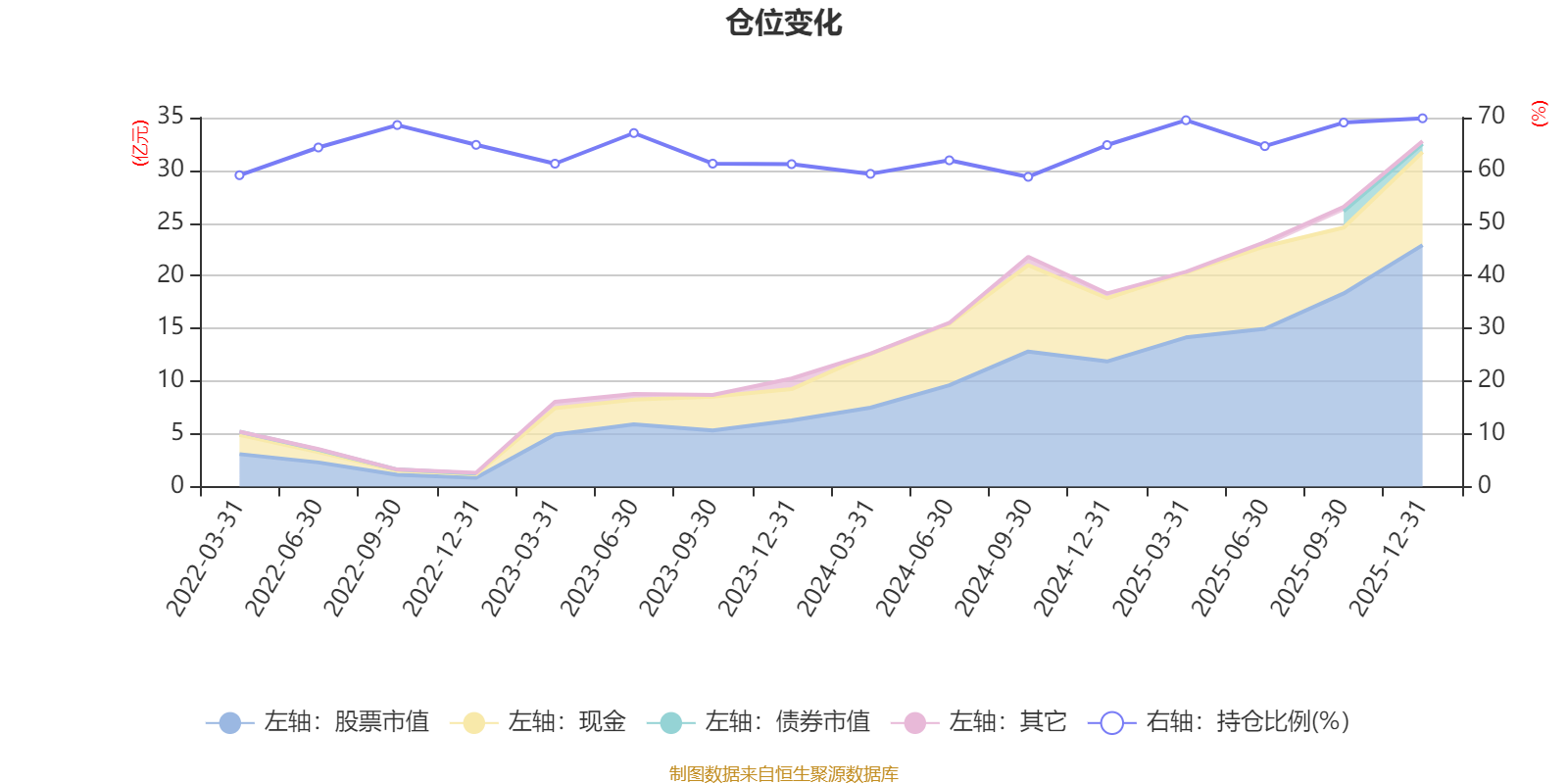 据定期报告数据统计,近三年平均股票仓位为64.05%,同类平均为87.64%。2025年末基金达到69.87%的最高仓位,2024年三季度末最低,为58.76%。
