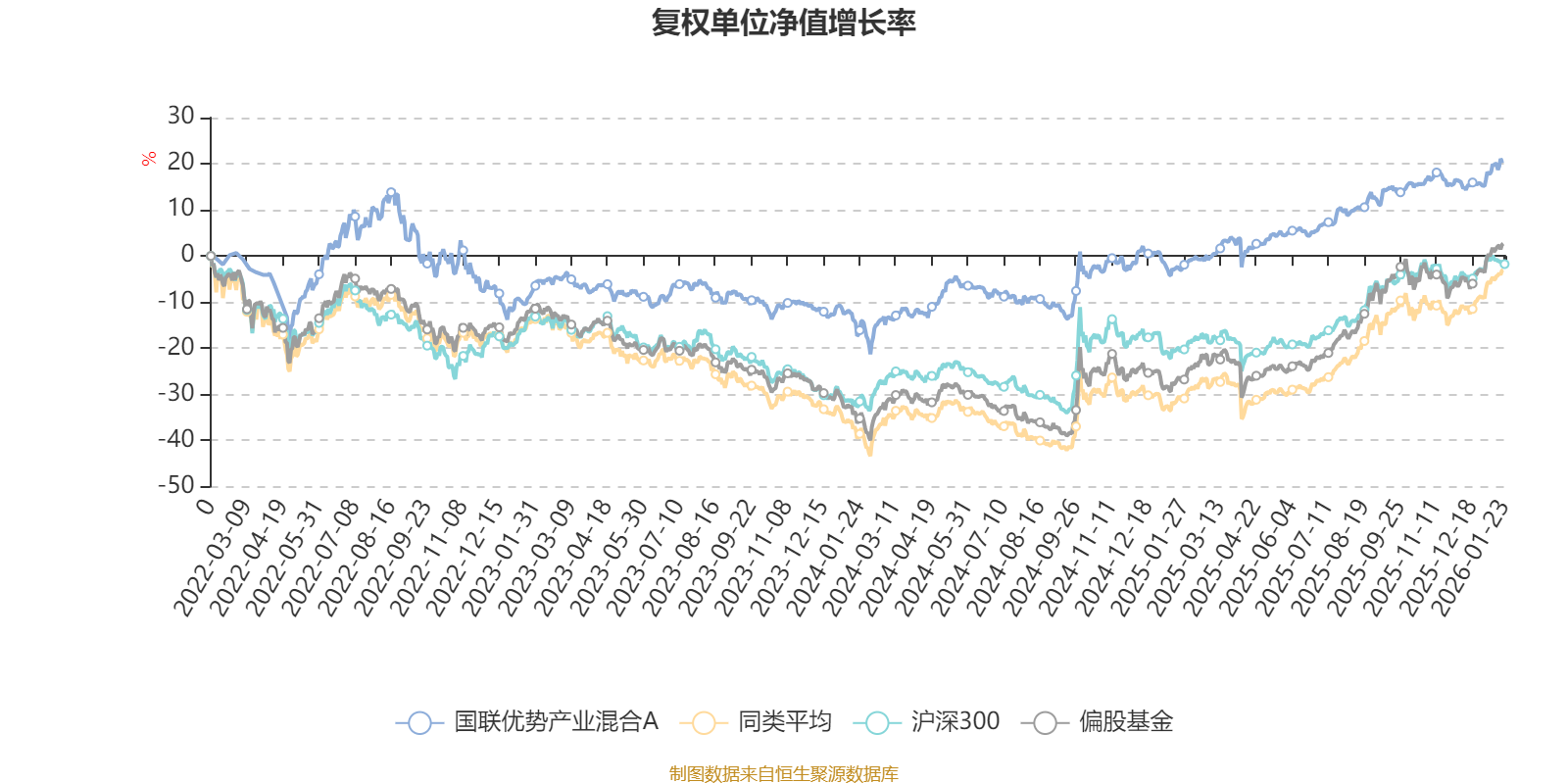 截至1月22日,国联优势产业混合A近三个月复权单位净值增长率为4.62%,位于同类可比基金139/185;近半年复权单位净值增长率为9.67%,位于同类可比基金155/185;近一年复权单位净值增长率为24.45%,位于同类可比基金147/183;近三年复权单位净值增长率为30.64%,位于同类可比基金44/176。