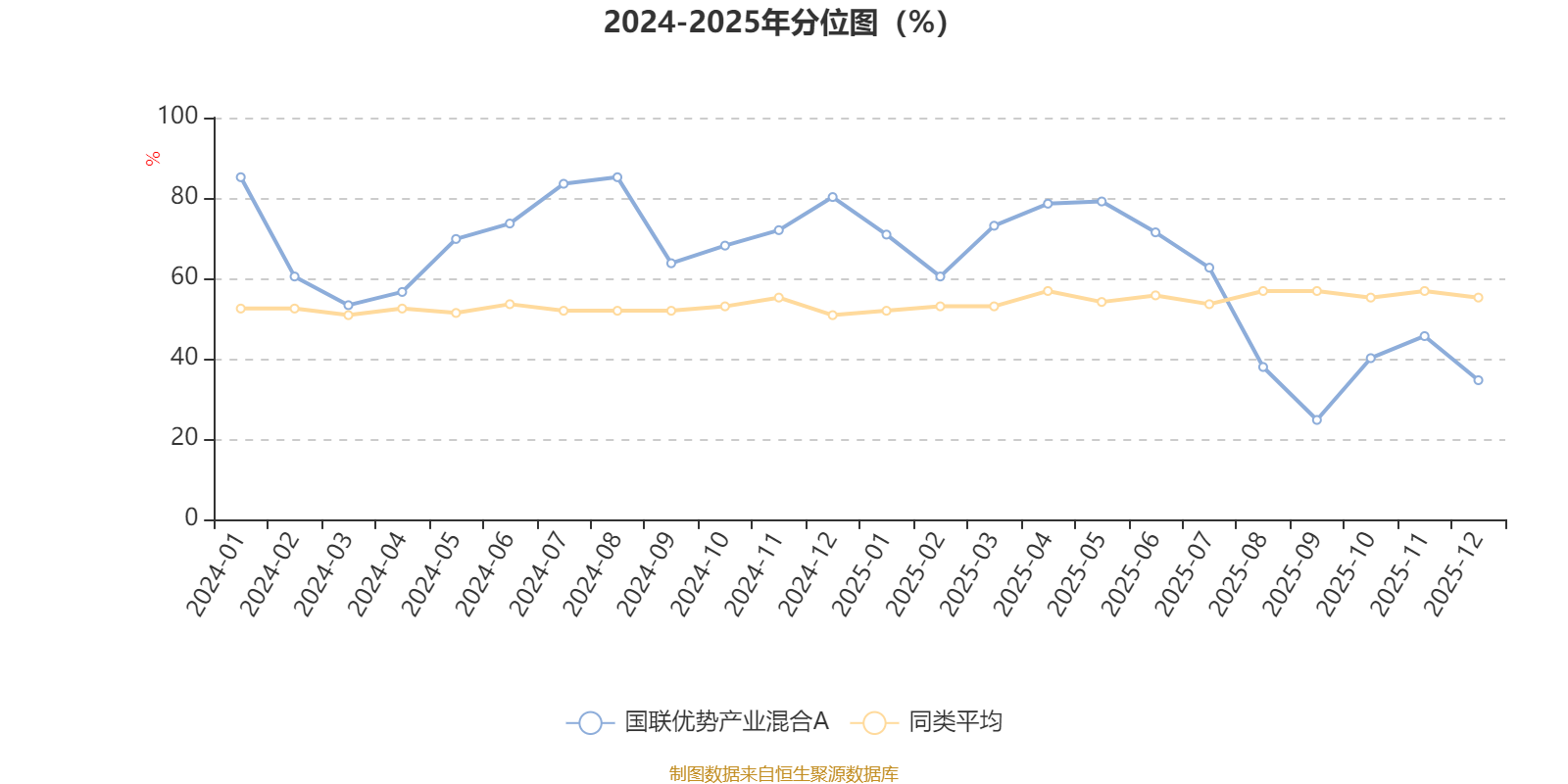 通过所选区间该基金净值增长率分位图,可以观察该基金与同类基金业绩比较情况。图为坐标原点到区间内某时点的净值增长率在同类基金中的分位数。