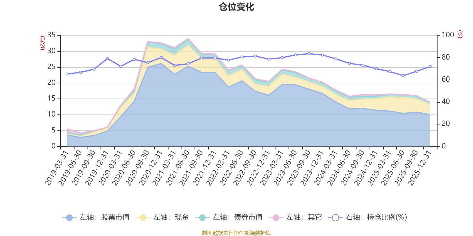 据定期报告数据统计,近三年平均股票仓位为74.67%,同类平均为72.57%。2023年三季度末基金达到83.54%的最高仓位,2025年上半年末最低,为63.77%。