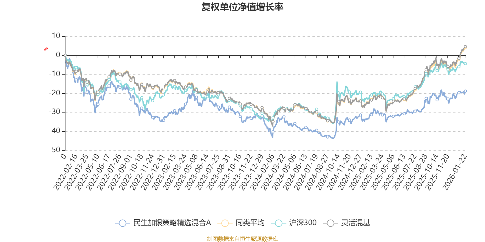 截至1月22日,民生加银策略精选混合A近三个月复权单位净值增长率为3.16%,位于同类可比基金971/1286;近半年复权单位净值增长率为14.99%,位于同类可比基金819/1286;近一年复权单位净值增长率为21.92%,位于同类可比基金879/1286;近三年复权单位净值增长率为16.21%,位于同类可比基金633/1286。