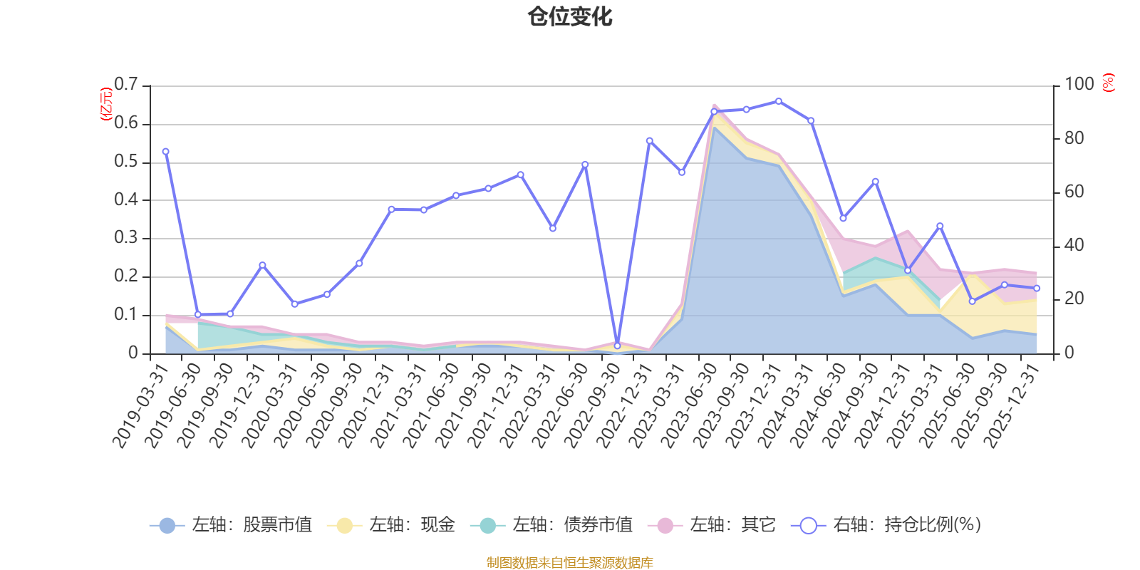 据定期报告数据统计,近三年平均股票仓位为57.76%,同类平均为72.57%。2023年末基金达到94.15%的最高仓位,2022年三季度末最低,为2.96%。