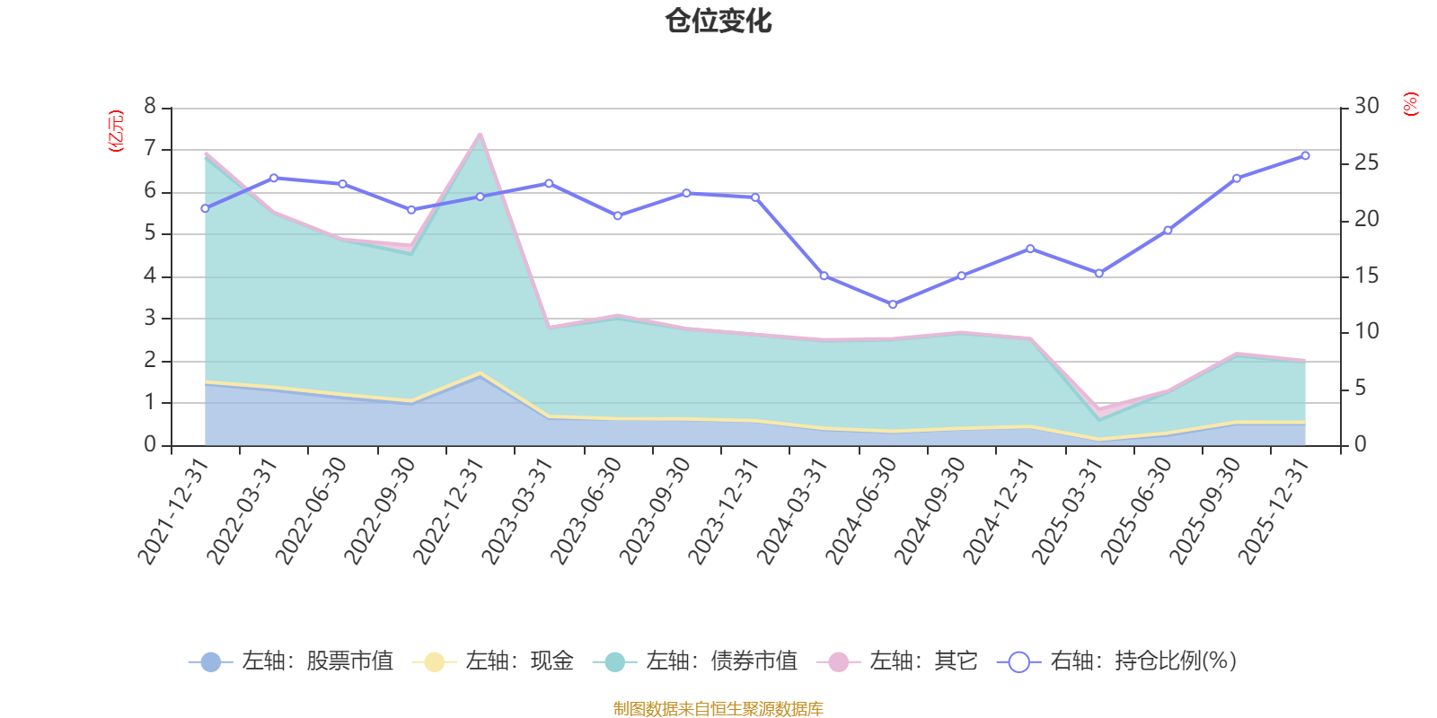 据定期报告数据统计,近三年平均股票仓位为19.35%,同类平均为19.2%。2025年末基金达到25.75%的最高仓位,2024年上半年末最低,为12.54%。