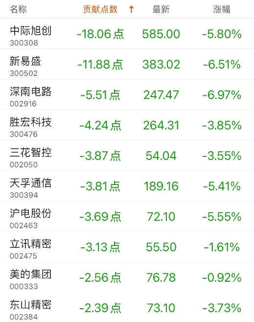 对深证成指贡献点数最多的个股是蓝思科技,贡献16.13点,该股当日涨14.95%,收盘价42.6元;拖累点数最多的个股是中际旭创,拖累18.06点,该股当日跌5.8%,收盘价585元。