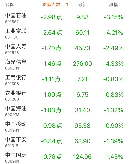 对上证指数贡献点数最多的个股是中国卫通,贡献0.91点,该股当日涨9.63%,收盘价42.48元;拖累点数最多的个股是中国石油,拖累2.98点,该股当日跌3.15%,收盘价9.83元。